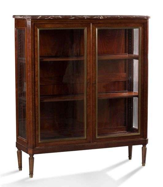 VITRINE en acajou et placage d'acajou ouvrant par deux portes vitrées et reposant sur quatre pieds balustres. Plateau de marbre rouge griotte.