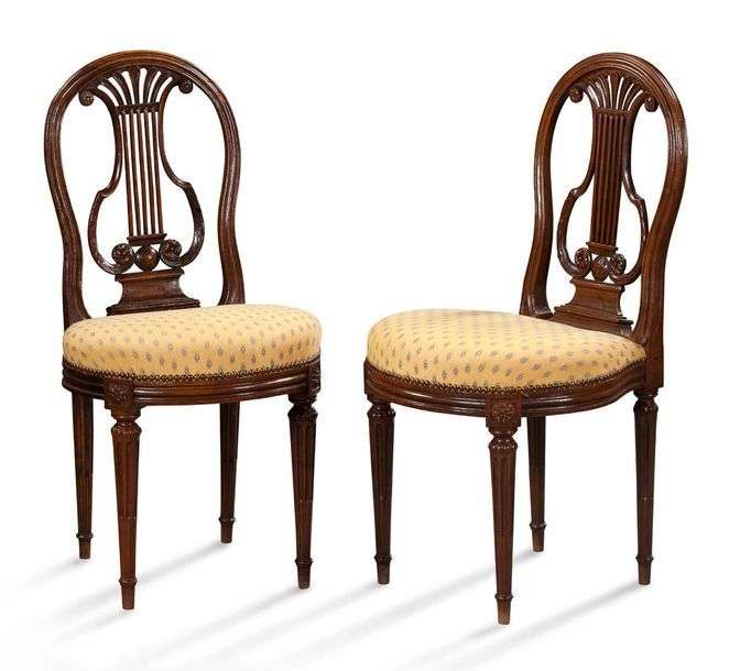 PAIRE DE CHAISES À DOSSIER FORMÉ D'UNE LYRE en bois naturel mouluré sculpté.