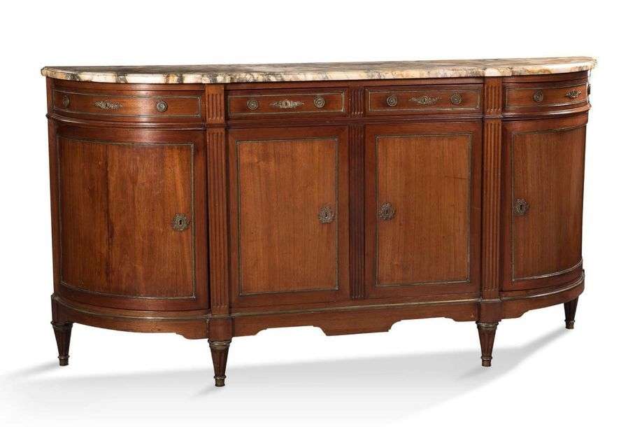 IMPORTANT BUFFET de forme demi-lune en acajou et placage d'acajou. Il ouvre en façade par quatre tiroirs et quatre portes. Montants plats à cannelures reposant sur quatre pieds toupies. Ornementation de bronzes ciselés dorés. Plateau de marbre blanc veiné jaune.