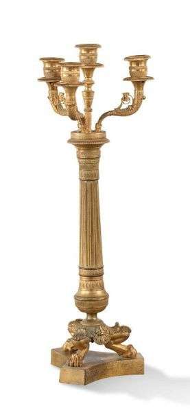 PAIRE DE FLAMBEAUX en bronze ciselé et doré à quatre bras de lumière reposant sur une colonne cannelée terminée par trois pieds griffes.