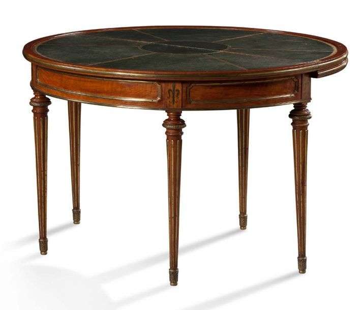 Elle ouvre par deux plateaux dont l'un garni d'un cuir vert doré aux petits fers. Elle repose sur quatre pieds fuselés à cannelures pleines de laiton.