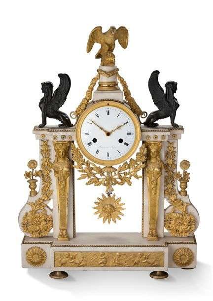 PENDULE PORTIQUE en marbre blanc et bronze ciselé à deux patines. Le cadran signé L'échopié Ainé à Paris est flanqué de colonnes aux cariatides et de sphinges. Elle est surmontée d'un aigle et repose sur quatre pieds toupies.