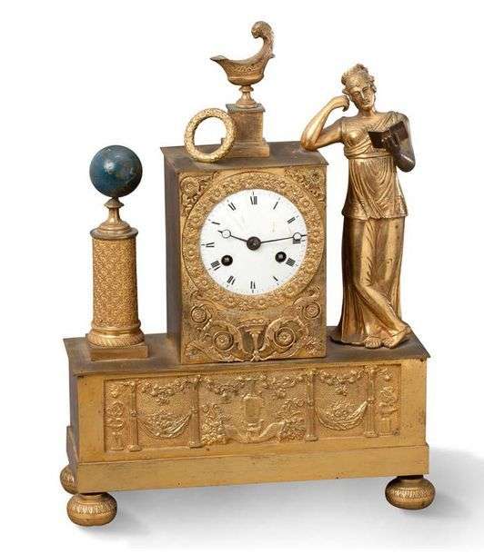 PENDULE en bronze ciselé et doré ornée d'une liseuse, le cadran émaillé blanc présente les heures en chiffres romains. Base quadrangulaire à décor antique d'une urne fleurie et de colonnettes. Elle repose sur quatre pieds boule.