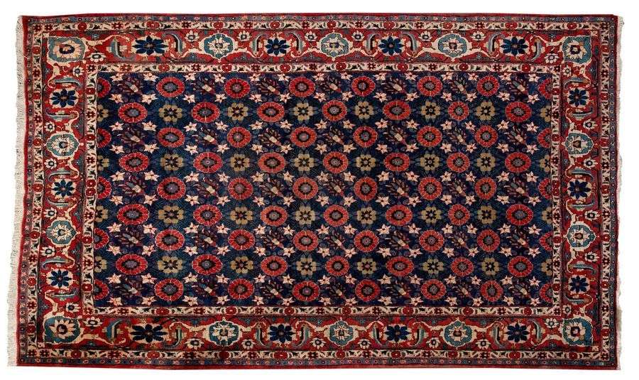 Important et assez fin tapis en velours en laine d'agneau sur fondation en coton. Champ bleu de Prusse, décor «MINA KHANI», pétales de fleurs encerclés en polychromie. Bordure principale rubis à palmettes et carapaces de tortues.