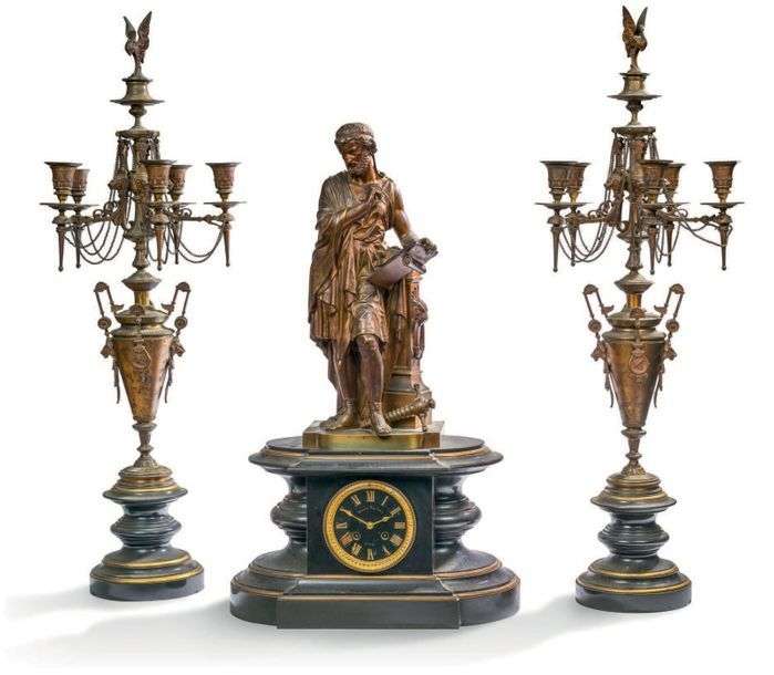 • IMPORTANTE GARNITURE DE CHEMINÉE en marbre noir et bronze ciselé doré. La pendule est surmontée d'une statuette en bronze patiné représentant Archimède. Le cadran de Gallois Fils, fabriquant à Paris.