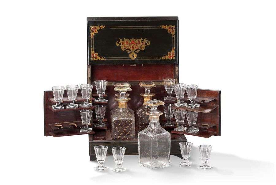 CAVE À LIQUEUR en bois laqué noir et or. Elle contient quatre carafes et seize verres à liqueur en cristal.