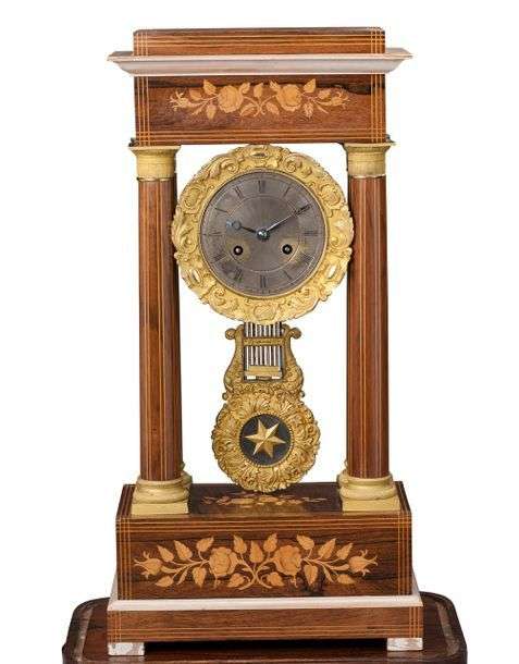 PENDULE PORTIQUE en marqueterie de fleurs et bronze ciselé doré.