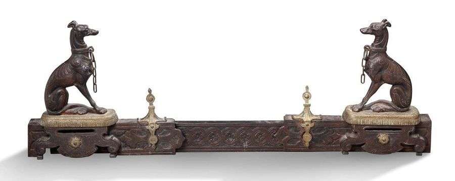 BARRE DE FOYER en bronze à deux patines ornée de deux chiens assis sur des coussins. Structure à décor d'une frise de postes.