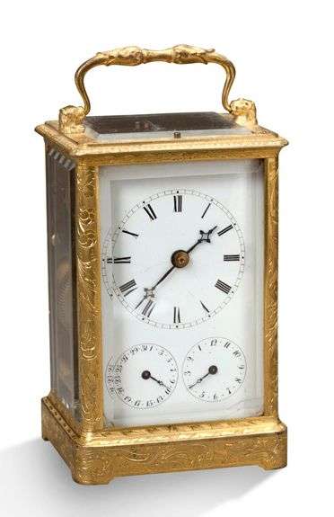 PETITE PENDULE D'OFFICIER À CAGE en verre et bronze ciselé de feuillages.
