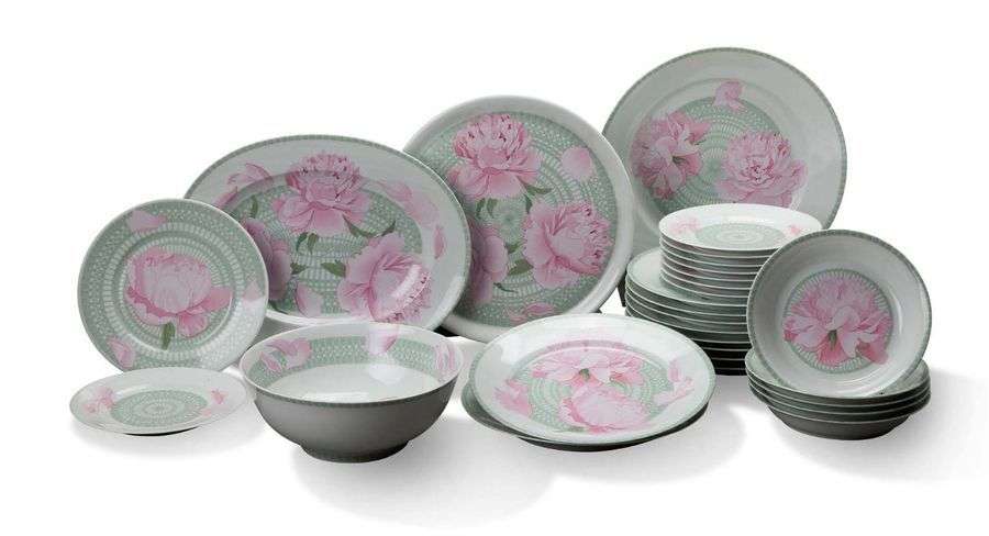 SERVICE PIVOINE en porcelaine 8 assiettes à dîner 8 assiettes à entrée 8 assiettes à dessert 8 assiettes creuses 2 grandes assiettes de présentation 2 plats de service: 1 rond, 1 ovale 1 saladier 1 plat à tarte