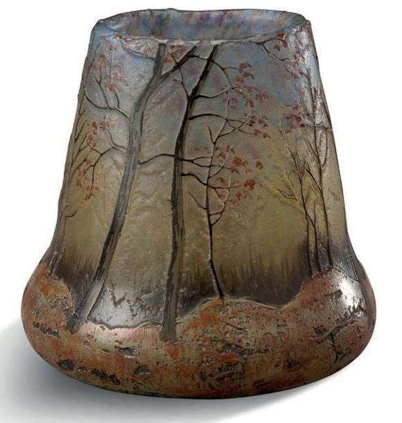 Vase en en verre multicouche à décor d'un paysage au bois, dégagé à l'acide.