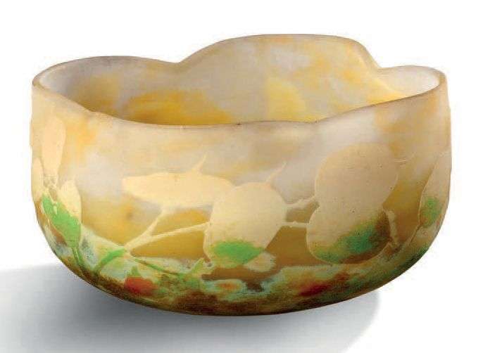 coupe de forme quadrilobée à bords pincés en verre multicouche à décor de fleurs de sureau dégagé à l'acide sur fond jaune nuancé.