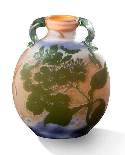 Important vase gourde à panse aplatie et anses latérales Epreuve en verre multicouche à décor de fleurs sur fond orangé et violet H: 31 - L: 25 cm