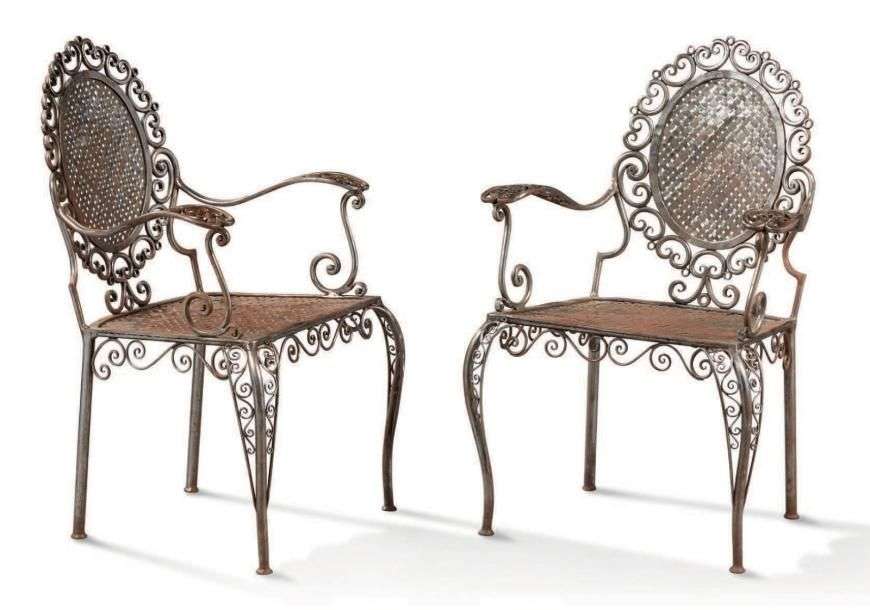 PAIRE DE FAUTEUILS DE JARDIN en acier ajouré de croisillons et enroulements. Bras et pieds cambrés.