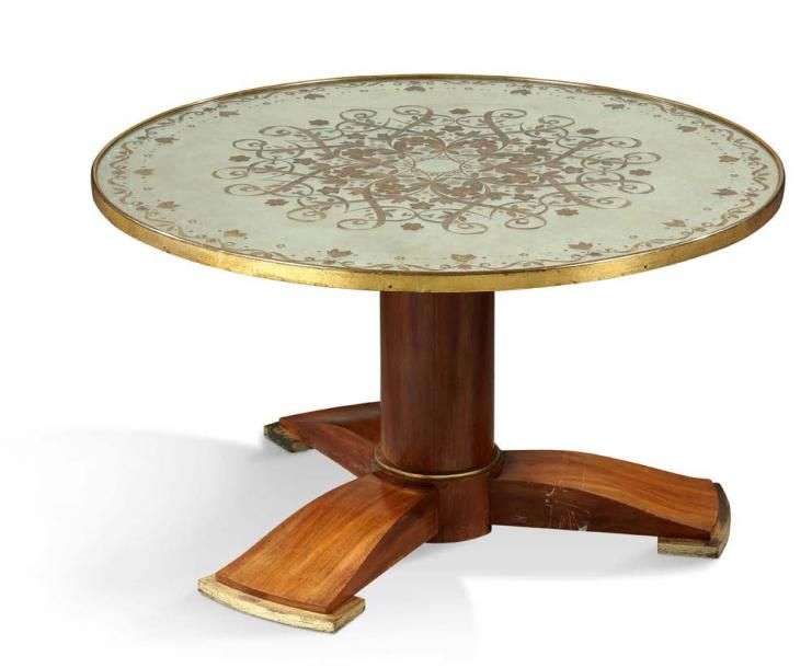 Guéridon en placage d'acajou à plateau circulaire en verre miroir églomisé à décor d'entrelacs et de motifs floraux reposant sur un fût central tubulaire se prolongeant par trois montants galbés terminés par des patins débordants en bronze doré.