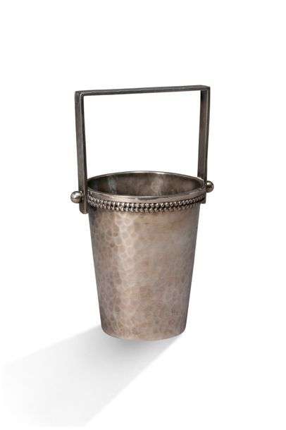 Seau à glace de forme tronconique en métal argenté, la panse à fond martelé, le col souligné de deux rangées de perles.