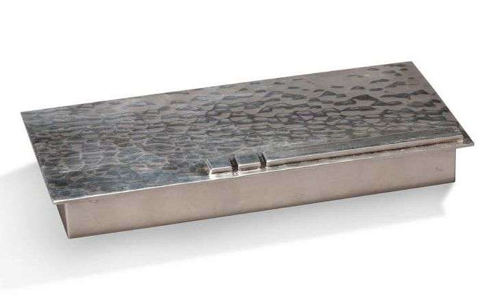 Boîte à cigarettes à corps quadrangulaire et fond plat en métal argenté martelé.