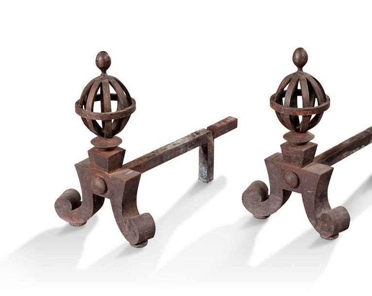 Paire de chenets en fer forgé martelé à corps d'astrolabe évidés en partie haute sur deux jambes en volutes et tige arrière de section carrée.