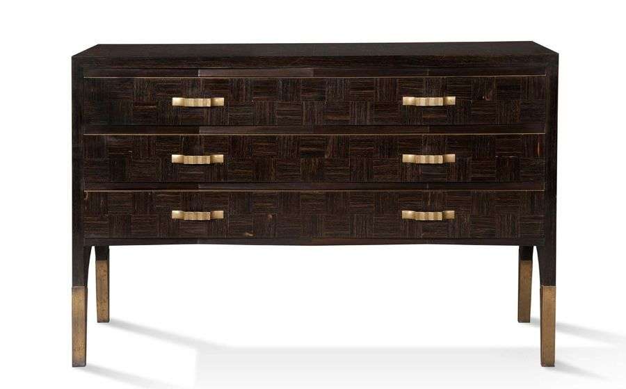 Commode en placage de damier d'ébène à corps quadrangulaire ouvrant par trois tiroirs en façade à double prise de tirage cranté en bronze doré sur piètement d'angle à jambes fuselées formant arceau latéral et ornementé en partie basse de laiton oxydé à l'acide.