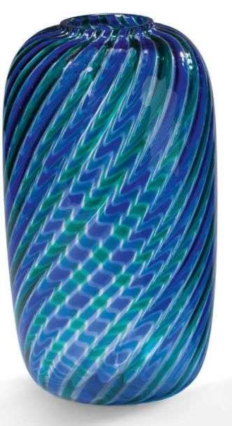 Vase tubulaire à col resserré dit «à canne» en verre soufflé translucide vert et bleu.