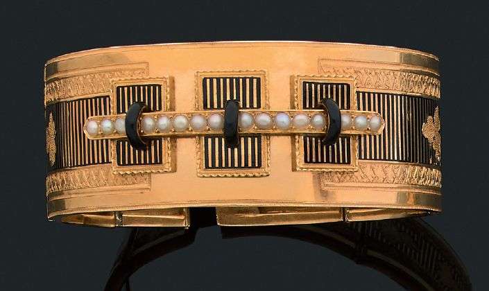 A gold, enamel and pearl bracelet.