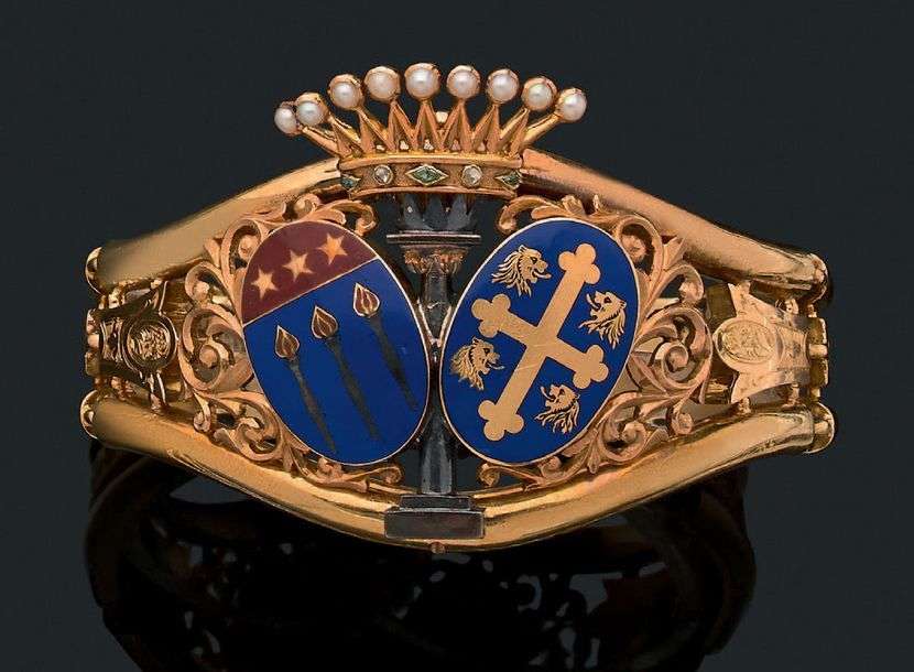 Blasons émaillés surmontés d'une couronne ornée de perles, émeraudes et diamants en rose, or jaune et rose 18k (750).