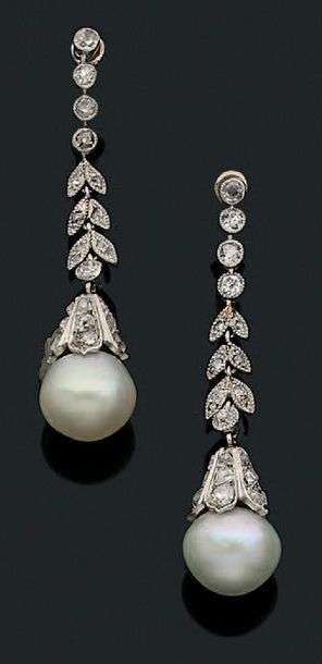 Paire de pendants d'oreilles diamants de taille ancienne, perles fines, pl