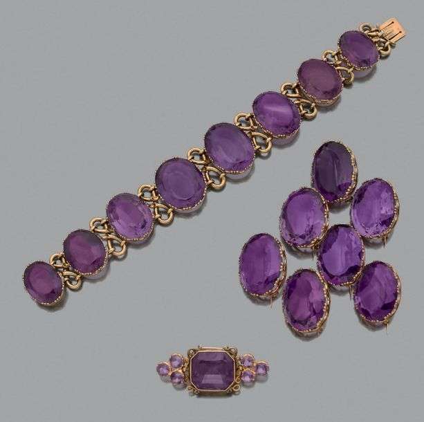 Bracelet et 7 broches, améthystes ovales, or 18k (750). Epoque XIXème