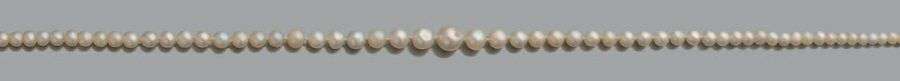 Collier de 135 perles supposées fines - non testées. Fermoir en platine (950) rubis cabochon et diamants.