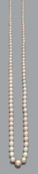Collier de 102 perles fines et 1 perle de culture en chute. Fermoir or jaune et diamants.