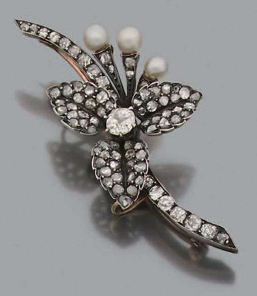 Diamants de taille ancienne et taillés en rose, perles fines, or 14K (585) et argent (<800).