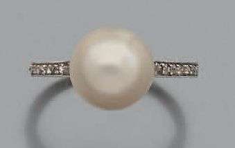 Bague «perle fine» perle fine bouton, diamants taillés en rose, platine (950). Td.: 52 - Pb.: 3.6gr