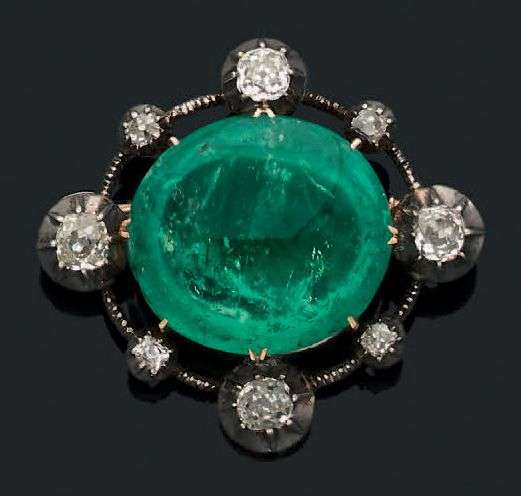 Emeraude cabochon, diamants de taille ancienne, or jaune 18k (750) et argent (<800).