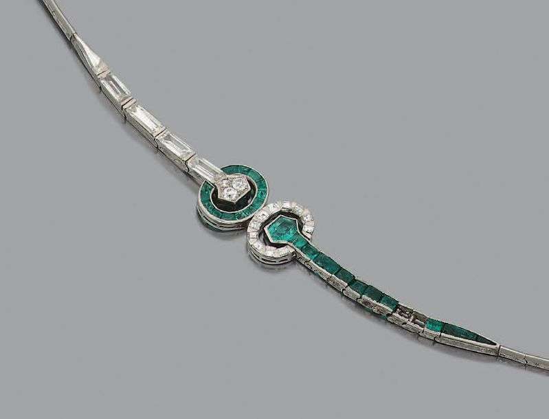 Bracelet articulé en platine (950) serti d'émeraudes calibrés et diamants