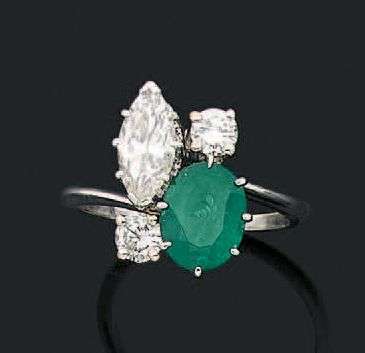 Emeraude ovale, diamant de taille navette et brillants, platine (950).