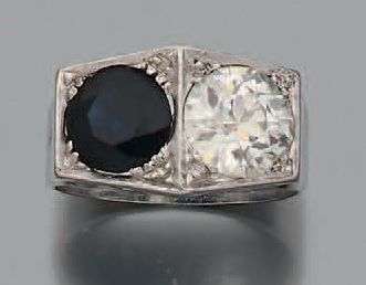 Diamant demi taille et d'un saphir, platine (950). Vers 1930.