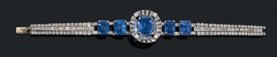 Important bracelet, saphirs rectangulaires,diamants de taille brillant et baguettes, platine (950) et or gris 18k (750). Signé monture CARTIER et numéroté. Trace de poinçon de maître. Long.: 16.6 cm - Pb.: 44.2gr. Accompagné d'un Certificat GPL N°14475 précisant. Poids des saphirs: 9.81- 7.86 - 6.31 4.75 - 4.59 cts. Origine: Ceylan. Pas de traitement thermique constaté
