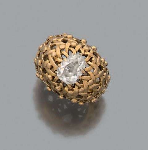 Bague boule, diamants de taille ancienne de forme poire et or jaune 18k (750) tressé. Dans son écrin.