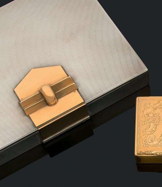 Minaudière à trois comportiments dont un poudrier, briquet et peigne, argent (<800) guilloché. Sac de velours noir.