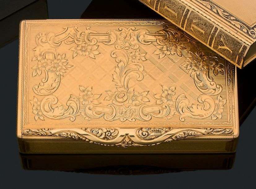 Poudrier ciselé de rinceaux et de fleurs, or jaune 18k (750).