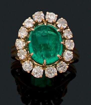 Emeraude cabochon, diamants de taille ancienne, or jaune 18k (750).
