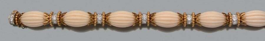 Bracelet corail blanc gravé, diamants de taille brillant, or 18k (750).