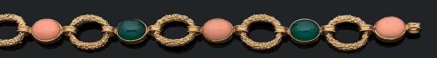 Bracelet or jaune granité 18k (750) cabochons de corail rose et chrysoprase.