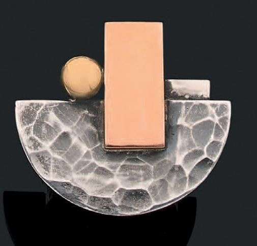 «Moderniste» Bague argent martelé (<800) or jaune et rose 18k (750. Signée, poinçon de maître. Td.: 54 - Pb.: 20.4gr. A silver and gold ring by JEAN DESPRES. Signed and stamped.