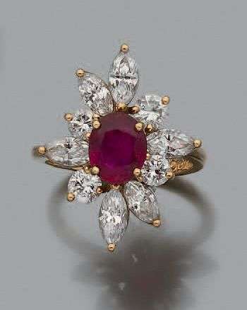 Or jaune 18k (750) rubis et diamants de taille brillant et navettes.