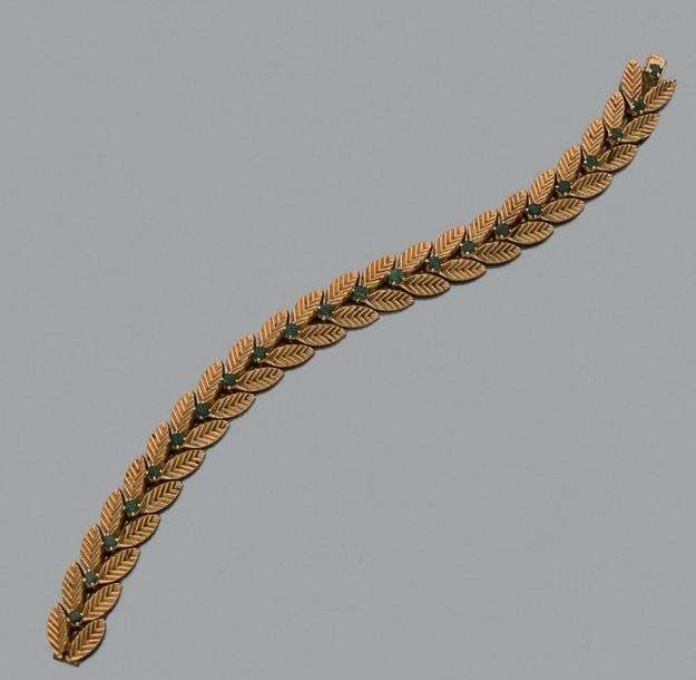 An emerald and gold bracelet.