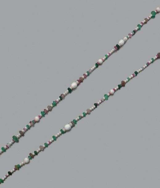 A diamond, ruby, emerald, tourmaline cultured pearl and gold long necklace.