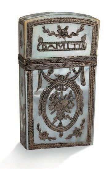 Inscription: «souvenir», en partie supérieure. Décoré en partie inférieure d'un médaillon au carquois et bouclier de l'Amour... Inscription «Damiti» sur la tranche.