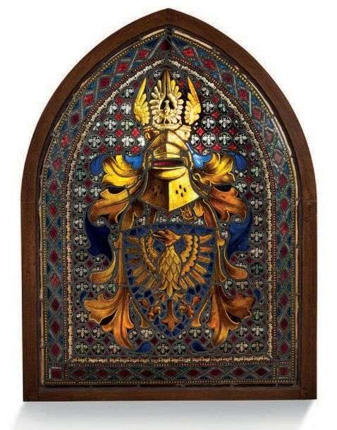 Three polychrome stained glass windows in warheads, from Ronchinne Castle.