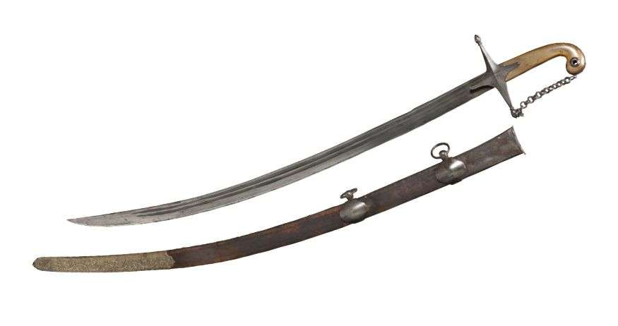 Poignée de corne blonde en forme de crosse traversée d'un oeilleton prévu pour recevoir une dragonne. Garde en fer à croisière losangique à deux quillons droits finissant en olive, dont l'une est reliée au pommeau par une chainette. Très belle lame courbe de fabrication orientale à deux gorges et contretranchant. Elle est marquée d'un cartouche composé de trois petits ronds flanqués de deux soleils. Fourreau en cuir à quatre garnitures, chape, deux anneaux de suspension et bracelets en bossette en fer et une bouterolle en cuivre repoussé anciennement argenté.